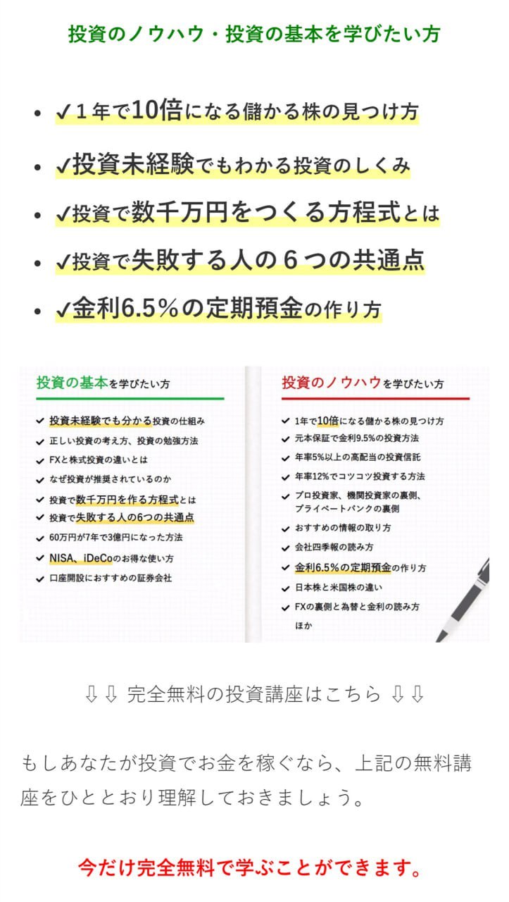 多くの投資家が失敗する理由は、正しい知識と戦略を持たないからです。馬渕磨理子は、日本の経済をより強くするために、一人でも多くの方に正しい投資の知識を身につけてほしいと考えています。そのために、この無料講座を提供することを決めました。